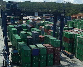 pada sebuah pelabuhan laut untuk mengangkat/memindahkan dan menumpuk